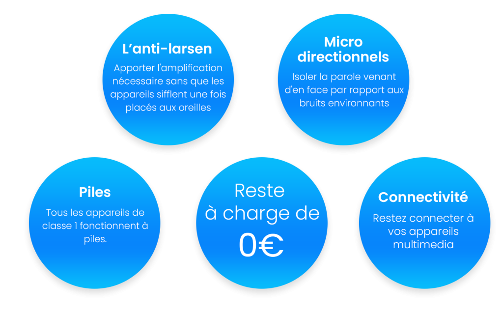 Si vous avez souscrit un contrat responsable auprès de votre mutuelle où que vous êtes bénéficiaire de la C2S (couverture santé solidaire), vous pouvez beneficier d'aides auditives accompagnées dun service de qualité pour un reste a charge de 0f. Depuis la reforme du 100% santé mise en place en 2021, les appareils de classe 1 doivent obligatoirement répondre a des contraintes techniques pour corriger convenablement l'audition.